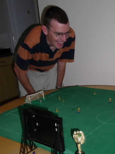The opening game struck fear into three of the four opponents. There were some of us who hadn't touched a Subbuteo player since the last tournament - however long ago that was. Mark had obviously not lost his touch. He cruised through the opening match, and whilst reigning champion Steve did not play at all badly, Mark looked like he'd never been away from the table. Turns out he hadn't! He'd had a 'practice' tournament with his brothers earlier in the year (which of course he won)! Credit where credit's due though, he's always been very good, although David Chett claims he was stitched up by having to play on the floor after a very long walk on his bad knees!.